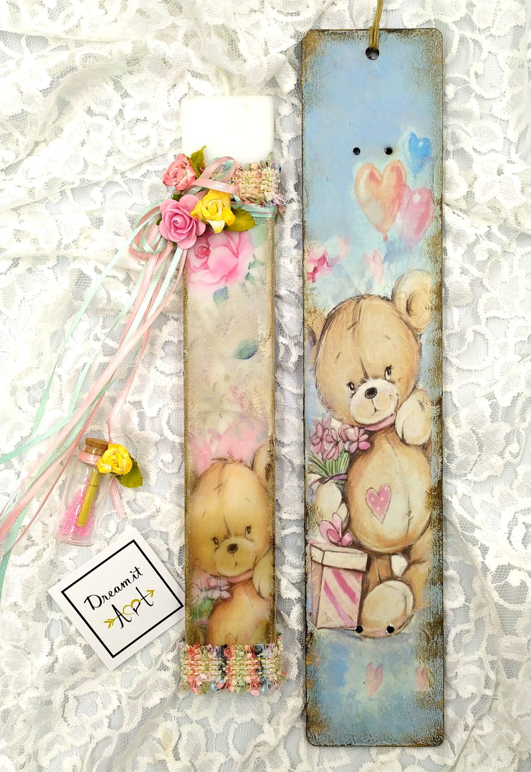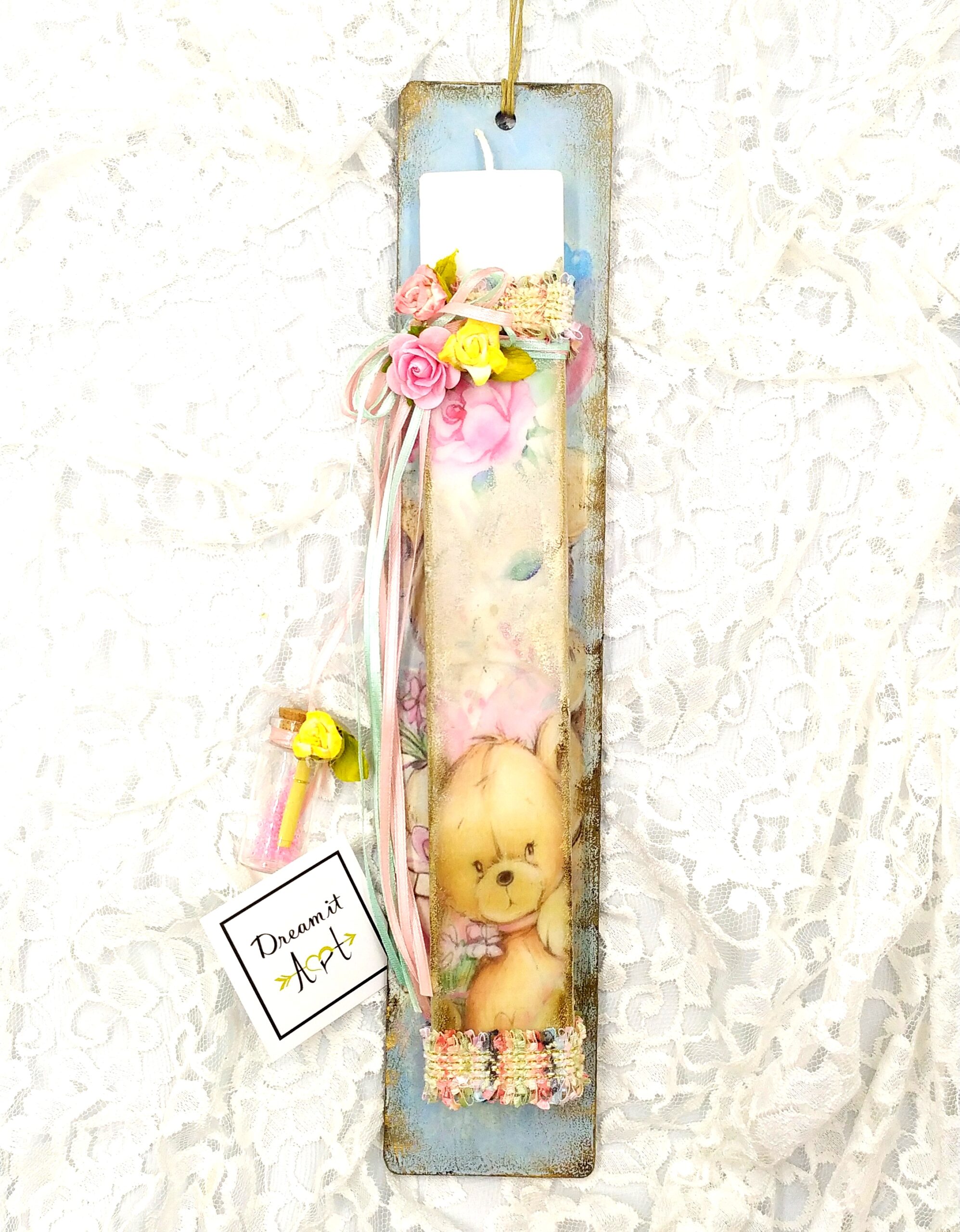 Χειροποίητη λαμπάδα ”ΤΟ ΑΡΚΟΥΔΑΚΙ ΤΗΣ ΑΓΑΠΗΣ” με ξύλινη πλάτη-καδράκι του ίδιου θέματος! Μια χαρούμενη ,γεμάτη χρώματα λαμπάδα που θα λατρέψετε!
